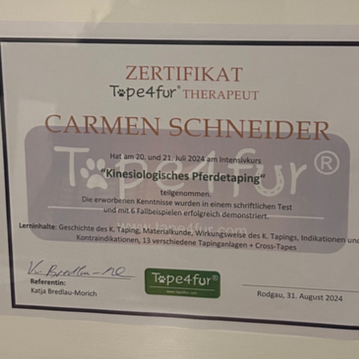 Ein zusätzliches Zertifikat als Tape-4-fur Therapeutin habe ich 2024 bei Katja Bredlau- Morich (Tape-4-fur) erlangt (Kinesiotaping- Fortbildung).
