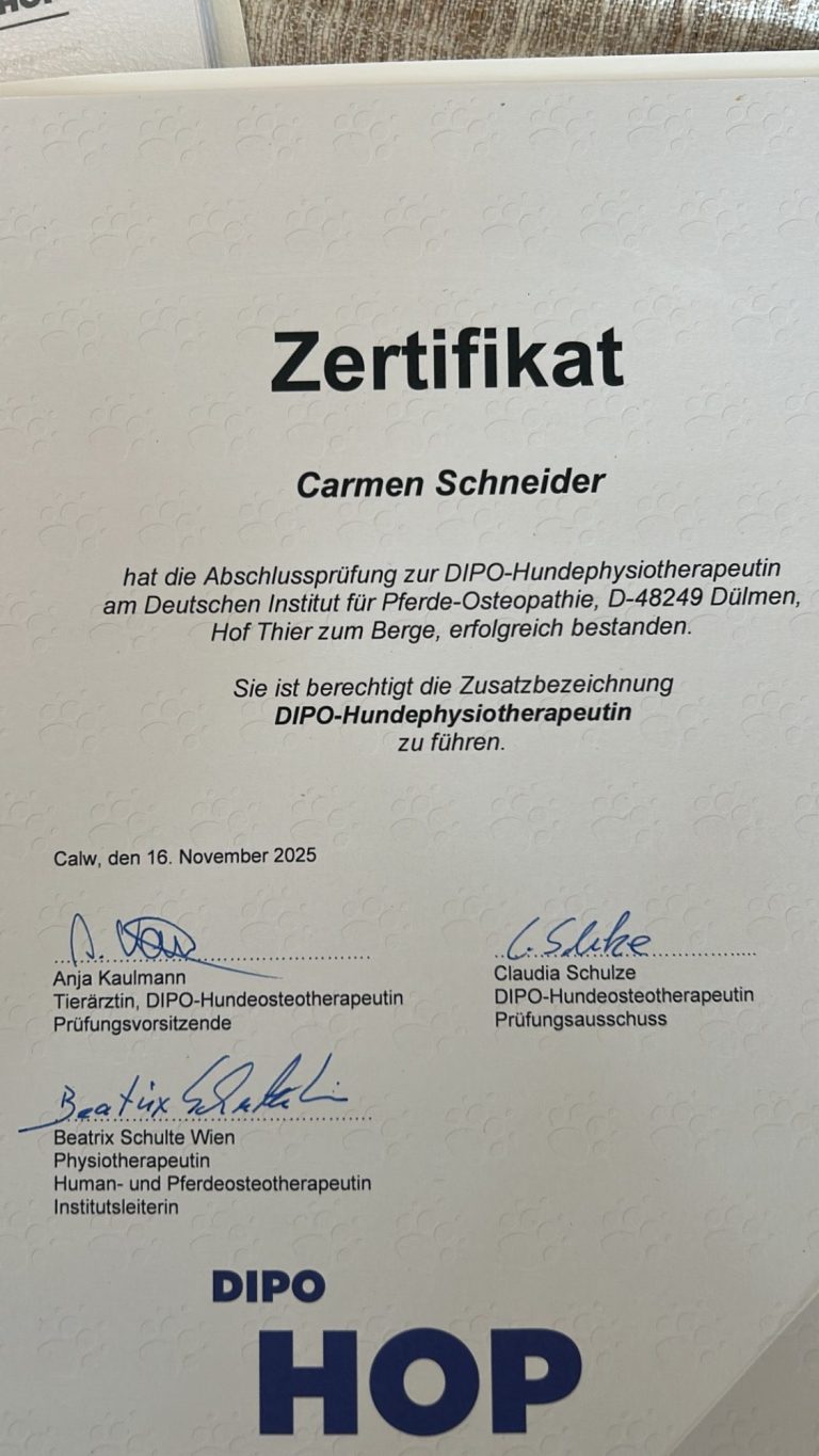 Meine Ausbildung als Hundephysiotherapeutin habe ich 2024-2025 am DIPO absolviert. Teile der Prüfung waren eine theoretische und praktische Prüfung.