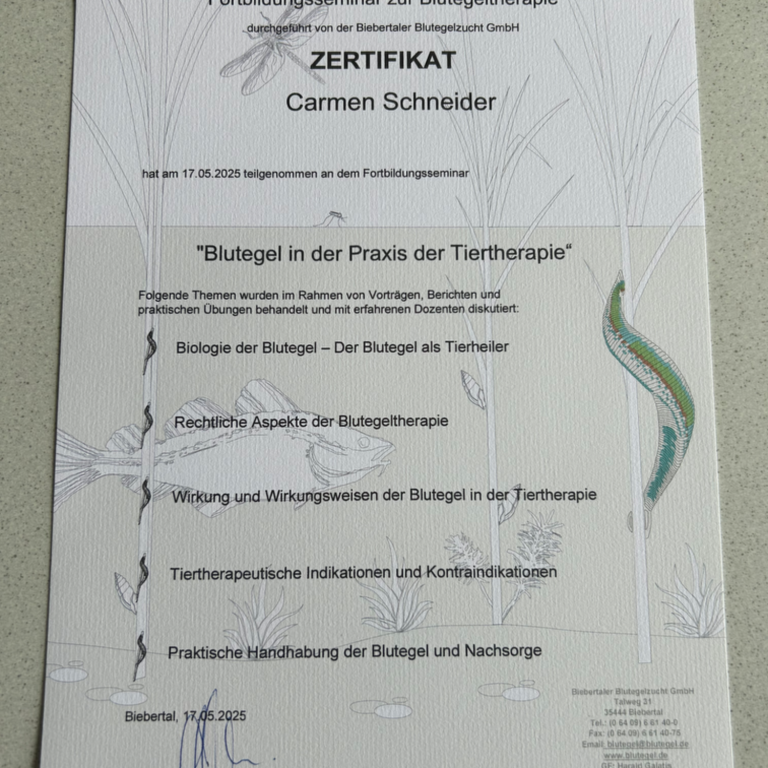 Im Mai 2025 habe ich mich bei der BBEZ (Biebertaler Blutegelzucht) weitergebildet und kann nun auch Blutegeltherapie anbieten.