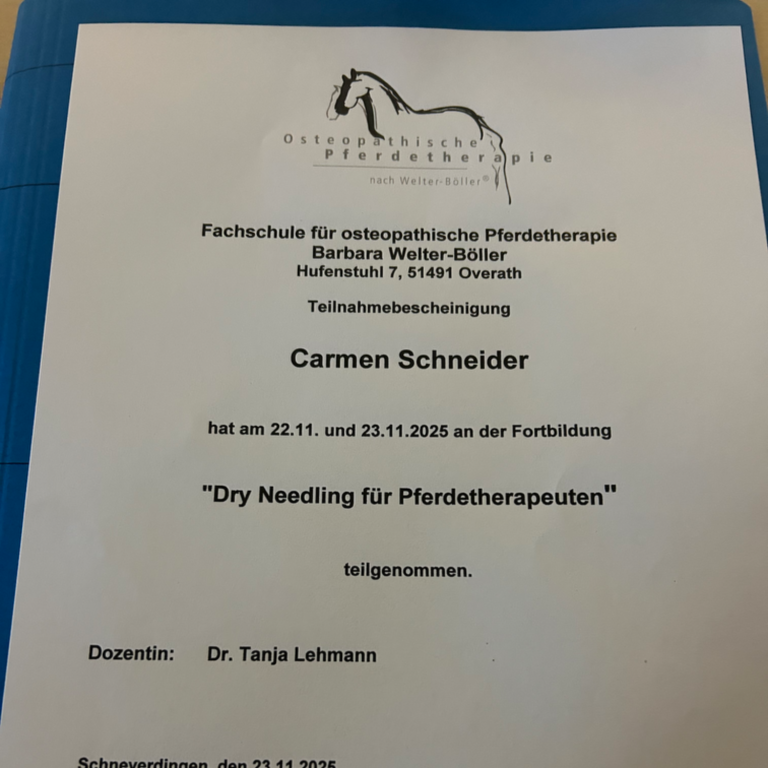 Seit November 2025 biete ich auch Dry-Needling an. Die Fortbildung hierzu habe ich an der Fachschule für osteopathische Pferde- und Hundetherapie Barbara Welter-Boeller absolviert.