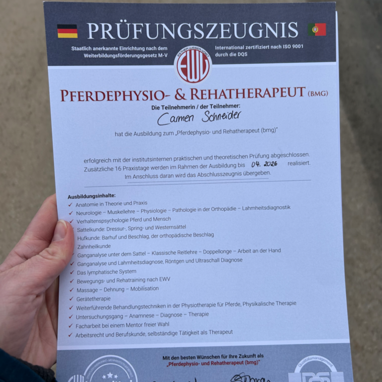 Meine Ausbildung als "Pferdephysio- und Rehatherapeutin (bmg)" habe ich bei Esther Weber-Voigt absolviert. Die Prüfung beinhaltete eine Facharbeit, eine theoretische, mündliche und praktische Prüfung.