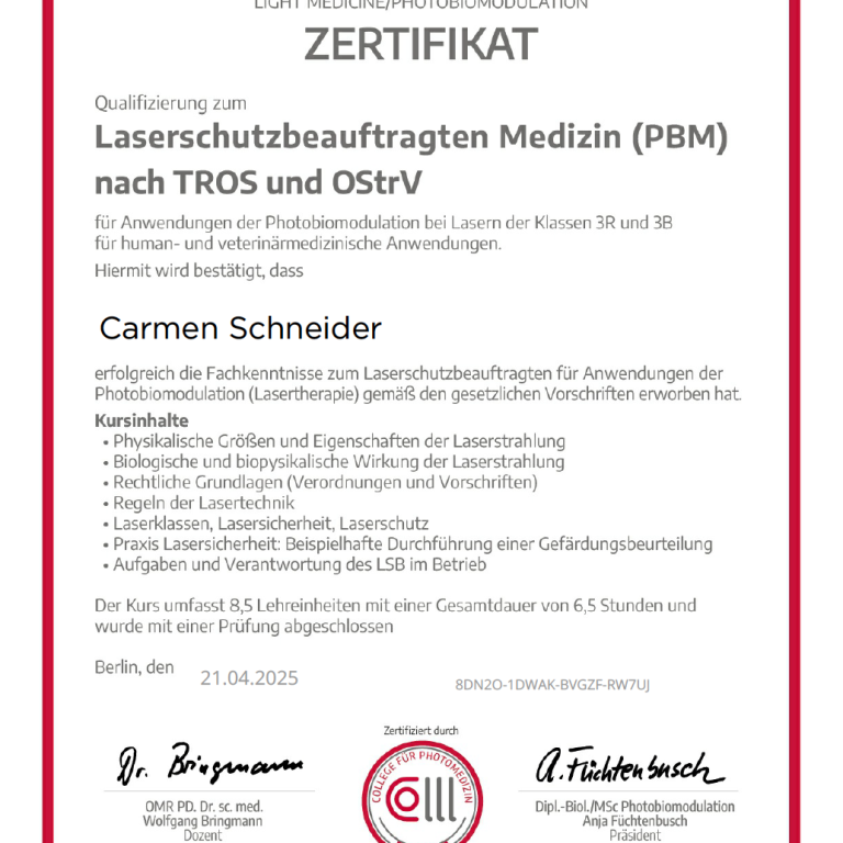 Zudem habe ich einen Zertifikat als Laserschutzbeauftragte Medizin und kann 3R und 3B Laser bedienen.